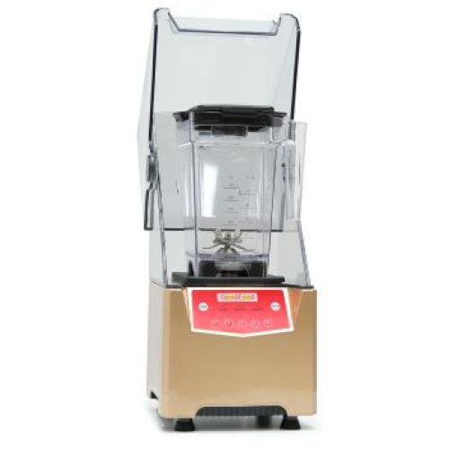 Блендер GoodFood PROFI BL2000 SOFT призначений для професійного використання в барах, кафе, ресторанах. Колба обємом 2.0 л виготовлена із міцного прозорого полікарбонату. Корпус із пластику золотого кольору. Має додатковий кожух для захисту від шуму.