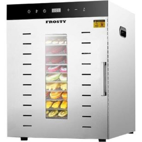 Дегідратор Frosty SS-12H призначений для якісного сушіння зелені, овочів, фруктів, грибів, в'ялення м'яса. Дана модель має 12 рівнів, відстань між рівнями 35 мм. В комплекті 12 сітчастих полиць 400*380 мм (сітка 8*8 мм). Максимально допустиме разове завантаження свіжих продуктів не більше 20 кг.