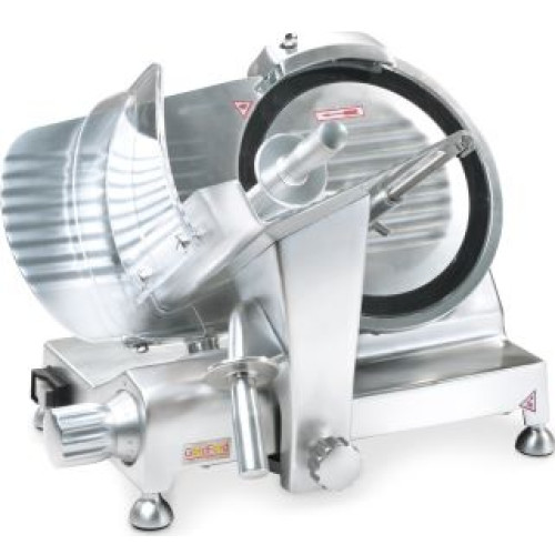 Ніж діаметром 250 мм плаский, виконаний із нержавіючої сталі. Максимальна ширина продукта для нарізки не більше 180 мм. Корпус виконаний із литого алюмінію. Вбудований механізм для заточування ножа.
