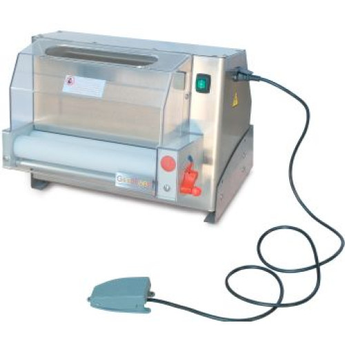 Виготовлена із нержавіючої сталі. Довжина ролика 400 мм. Товщина розкатки тіста від 0,7 до 5,4 мм. Підходить для ваги заготовок від 50 до 500 грам. Розкачуване тісто для піци діаметром від 100 до 400 мм. Одна пара валків із харчового полікарбонату. Постачається в комплекті з педаллю контролю швидкості.