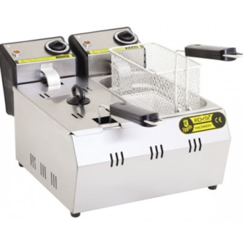Две ванны объемом по 3 л. Корзинки размером 200*120*110 мм. Корпус, крышка, сетка выполнены из нержавеющей стали. Включается фритюрница терморегулятором. От перегрева встроенный термостат с защитой, который автоматически отключает оборудование в случаи перегрева. Удобная разборная конструкция фритюрницы позволяет содержать оборудование в чистоте. О включении аппарата сигнализирует световой индикатор.