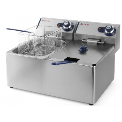 Фритюрница профессиональная Hendi Blue Line 205839 предназначена для приготовления блюд во фритюре. Данная модель имеет две емкости для масла объемом 8 л. Емкость и корзинки выполнены из нержавеющей стали. Корзинка размером 240*180*140 мм. Длинная изолированная ручка корзинки обеспечивает удобство в работе.