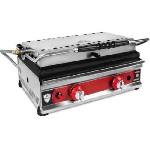 Корпус виконаний із нержавіючої сталі, робоча поверхня із чавуну. Верхній та нижній нагрів одночасно забезпечує швидке приготування. Нагрів верхньої і нижньої робочих поверхонь регулюється окремо. Прижимна пружина регулює тиск верхньої поверхні під товщину продукту. В комплекті висувний піддон для залишків жиру. Підключається до балонного газу LPG. Витрати газу 0,37 м.куб/ год.