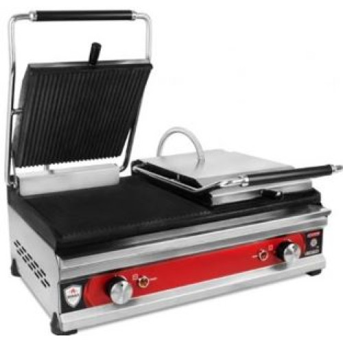 Корпус виконаний із нержавіючої сталі, робоча поверхня із чавуну. Дві незалежні робочі зони. Верхній та нижній нагрів одночасно забезпечує швидке приготування. Встановлений температурний режим від +50 до +300 С автоматично підтримується термостатом. Прижимна пружина регулює тиск верхньої поверхні під товщину продукту. В комплекті висувний піддон для залишків жиру.