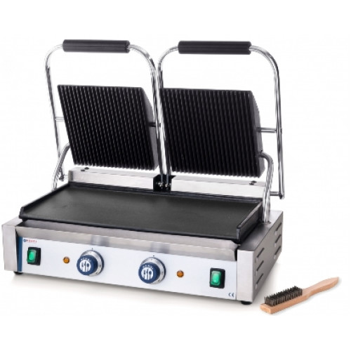 Контактный (прижимной) HENDI 263808 используют для обжаривания и запекания мяса, рыбы, сыра, овощей. Даная модель имеет 2 пары рабочих поверхностей из чугуна (верх рифленый, низ гладкий). Размер рабочей поверхности 475х230 мм.