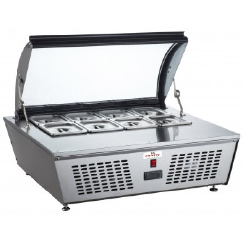 Корпус трапецеевидный (к низу зауженный) из нержавеющей стали. В комплекте гастроемкости с крышками - 8 шт. Гастроемкости размером GN1/6-150. Температурный режим хранения продукта от -18 до -25 С. Заданная температура отображается на цифровом дисплее. Для включения и выключения витрины предусмотрена аналоговая кнопка (on/off). Оснащена витрина прозрачным колпаком, что позволяет соблюдать гигиеническую безопасность при открытых гастроемкостях.