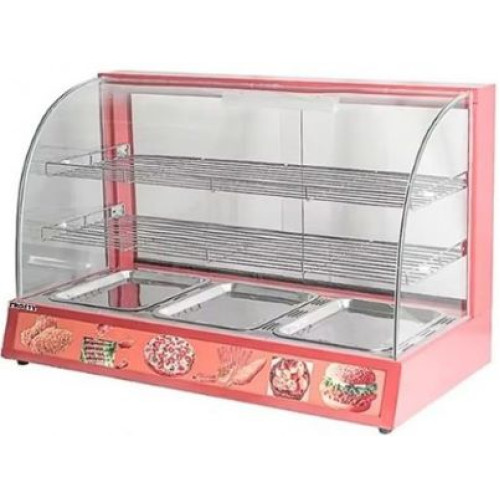 Зволоження наливне. Температурний режим +30...+85 С встановлюється і автоматично підтримується термостатом. LED підсвітка. Зі сторони продавці розсувні дверціята. Каркас - фарбований метал. Фасадне скло гнуте.