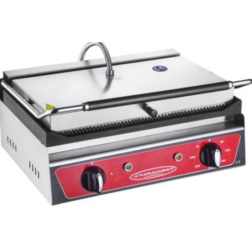 Рабочая поверхность ребристая, чугунная размером 470*280 мм. Диапазон рабочих температур от +50 до +300 С. Корпус выполнен из нержавеющей стали. Благодаря двустороннему нагреву, сокращается время на приготовление, что позволяет сократить затраты на электроэнергию и уменьшить теплопотери Для сбора остатков масла имеtтся съемный лоток.