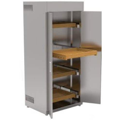 Корпус шкафа выполнен из нержавеющей стали, двери распашные. В комплекте четыре деревянные выдвижные лотки. Боковые стенки оснащены двухуровневой вентиляцией, что позволяет потокам воздуха свободно циркулировать внутри. Ножки регулируются по высоте.