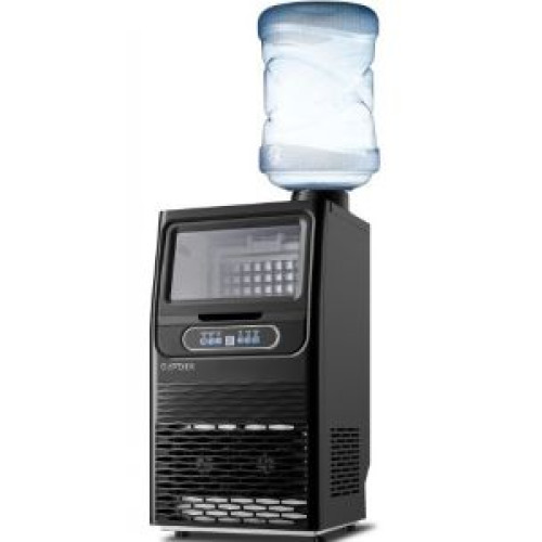 Особливістю даного льодогенератора є підключення: підключається до загального водопостачання або через встановлений бутель з водою. Місткий бункер для зберігання готового льоду (на 5 кг) з LED-підсвіткою. Цифрова панель управління. Оснащений таймером, автоматичним очищенням та індикатором наповнення бункера. В комплекті фільтр очищення води. Корпус фарбований метал, передня панель пластикова. Холодоагент R290.