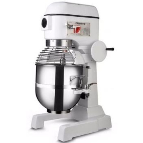 Міксер планетарний Frosty B-40B призначений для приготування рідкого тіста, соусу, взбивання білків, кремів. Дежа об'ємом 40 л. В комплекті три насадки: вінчик, лопатка, спіраль. Насадки і дежа виготовлені із нержавіючої сталі. Корпус алюмінієвий.