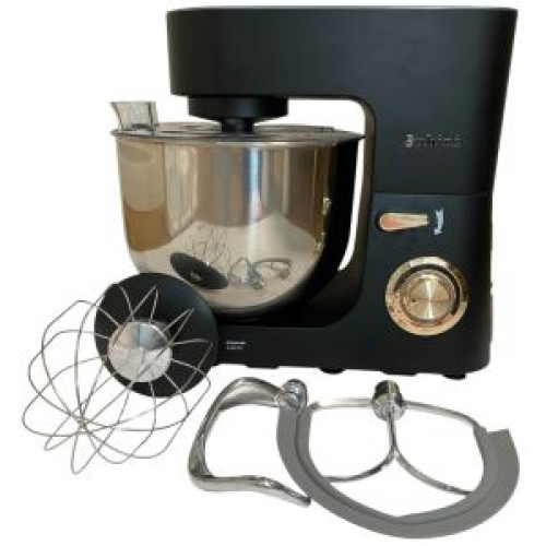 Чаша об'ємом 8 л із нержавіючої сталі. В комплекті захисна кришка та 3 насадки: вінчик для взбивання, плоский бітер для змішування, гак для замісу. 8 режимів швидкості дозволяють підібрати необхідний режим для технологічного процесу. LED-підсвітка регулятора перемикача швидкостей. Імпульсний режим дозволяє короткочасне працювання на максимальній потужності. Зручна механічна панель управління. Кріплення насадок до корпусу двигуна здійснюється спеціальним фіксатором, завдяки якому насадки надійно зафіксовані навіть при дуже швидкому обертанні. Двигун безшумний із захистом від перенавантажень. Корпус із міцного ABS-пластику чорного кольору.