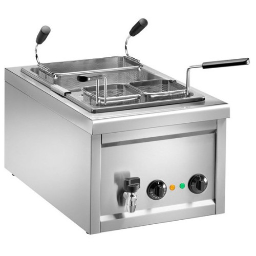 На разогрев необходимо 20 минут, а на приготовление - 3 минуты. Оборудована макароноварка FROSTY CC11 краном для слива воды. Изготовлена из нержавеющей стали.