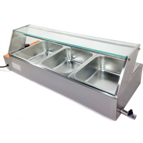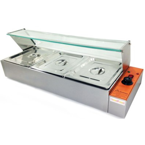 Мармит электрический GoodFood BM3G используют для разогрева готовых блюд. Разогрев происходит парой, что обеспечивает равномерный и более мягкий нагрев. Изготовлен мармит из нержавеющей стали. Укомплектован стеклянной витриной.