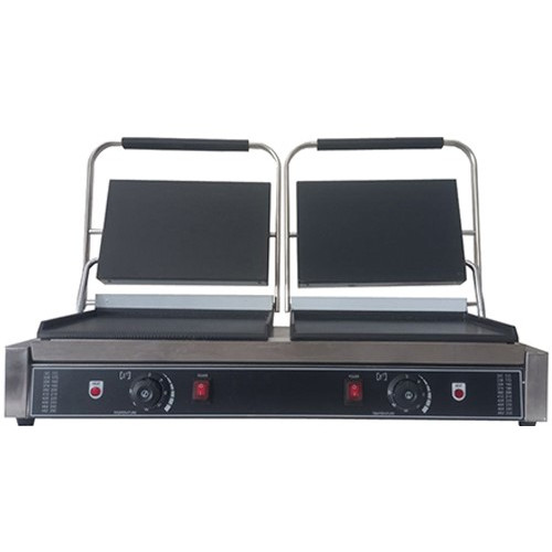 Верхня і нижня робочі поверхні гладкі, виготовлені із чавуну. Корпус гриля із нержавіючої сталі. Нижні дві робочі поверхні розміром 355х235 мм, дві робочі поверхні розміром 335х215 мм. Верхня частина фіксується в необхідному положенні за допомогою пружини. Температурний режим від +50 до +300 С підтримується термостатом. Для збіру жиру передбачено знімний лоток (жирозбірник). Поставляється без електричної вилки.
