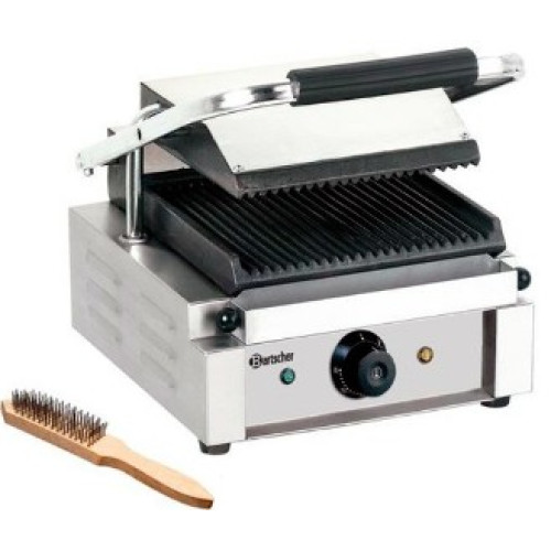 Рабочие части рифленые, выполнены из чугуна, корпус из нержавеющей стали. Размер верхней части 214*214 мм, а нижняя часть размером 220*235 мм. Температурный режим от +50 до +300 С регулируется и автоматически поддерживается термостатом. Для сбора жира предусмотрен выдвижной поддон. Визуальный контроль разогрева аппарата (световой индикатор).