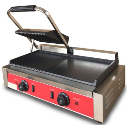 Нижняя рабочая поверхность размером 475*230 мм, верхняя рабочая поверхность 214*214 мм. Рабочие поверхности из чугуна с антипригарным покрытием, корпус из нержавеющей стали.