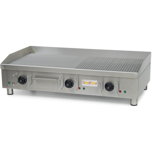Встановлений температурний режим від 0 до +300 С автоматично підтримується термостатом. Механічна панель управління. Три робочі зони з незалежним керуванням. Робоча поверхня комбінована: гладка та ребриста, розміром 900х400 мм, товщина сталі 16 мм. Корпус, робоча поверхня виготовлені із нержавіючої сталі. Постачається без електричної вилки.