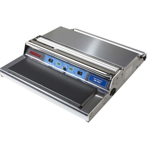 Все деталі корпусу виготовлені із нержавіючої сталі, поверхня для нагріву з тефлоновим покриттям. Термоніж з тефлоновим покриттям постійного нагріву для обрізки плівки. Розмір гарячої поверхні 390*124 мм. Використовувати харчову ПВХ плівку шириною 380, 400, 430, 450 мм. Температура нагріву регулюється в діапазоні +70...+90°С.