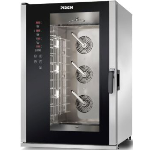 Температурный режим от +30 до +270 С. Три трехскоростных реверсивных вентилятора усиливают поток воздуха внутри печи, что гарантирует равномерный процесс приготовления блюд. Таймер и подсветка камеры позволяет визуально наблюдать за процессом готовки. Регулирование подачи пары позволяет сократить время приготовления. Имеется функция предварительного нагрева камеры.