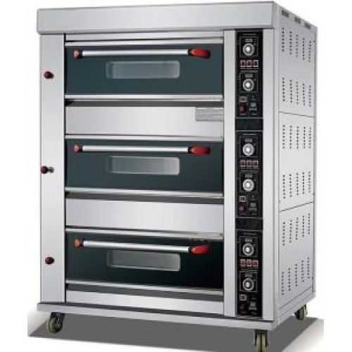 Данная модель имеет три камеры, размер камеры 850*650*250 мм (в комплекте шесть противней 600*400 мм). Противни устанавливаются на металлический под. Управление механическое. Независимое управление каждой камеры.