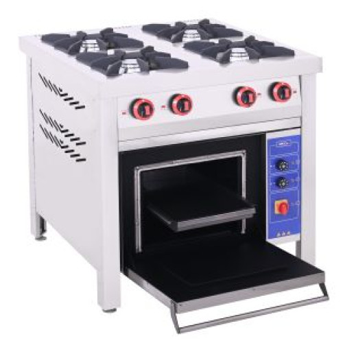 Конфорки из чугуна размером 335*335 мм позволяют использовать посуду большим объемом. Для повышения эффективности и быстрого нагрева используются двухрядные газовые горелки с микроперфорацией. Тепловая мощность одной конфорки 6,5 кВт. Для безопасности газовые конфорки оборудованы газконтролем.