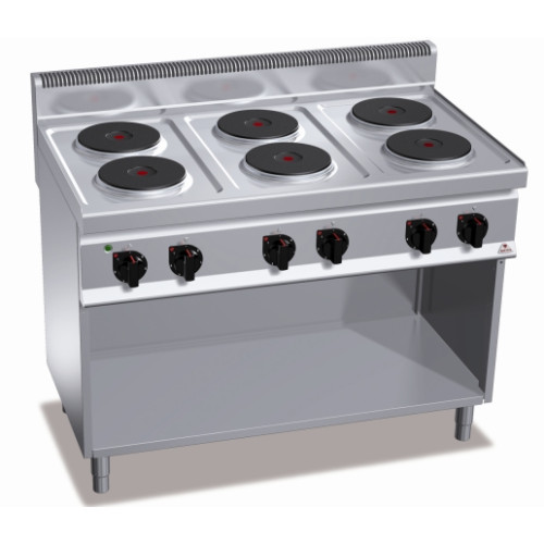 Плита электрическая Bertos E7P6M напольная без духовки идеально подойдет для приготовления первых и вторых блюд на профессиональной кухне. Имеет 6 круглые чугунных конфорок диаметром 220 мм и мощностью по 2,6 кВт. Температурный режим устанавливается с помощью шестипозиционного регулятора температуры от 50 до 400С.