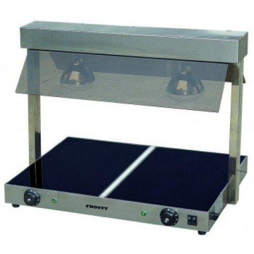 Две зоны нагрева из стеклокерамики, размером 325*530 мм, с раздельной регулировкой температуры. Вверху установлены две инфракрасные тепловые лампы мощностью по 250 Вт. Температурный режим от +30 до +85 С. Корпус выполнен из нержавеющей стали.