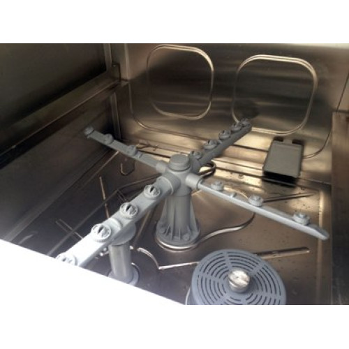 Используются кассеты размером 500*500 мм. Производительность данной машины 30-40 корзин в час, а вмещается в одну корзину 14-16 тарелок. Использовать тарелки максимальной высотой 320 мм. Предусмотрено три варианты программ мойки: 90, 120 и 180 секунд. На один цикл расход воды 2,5 л.