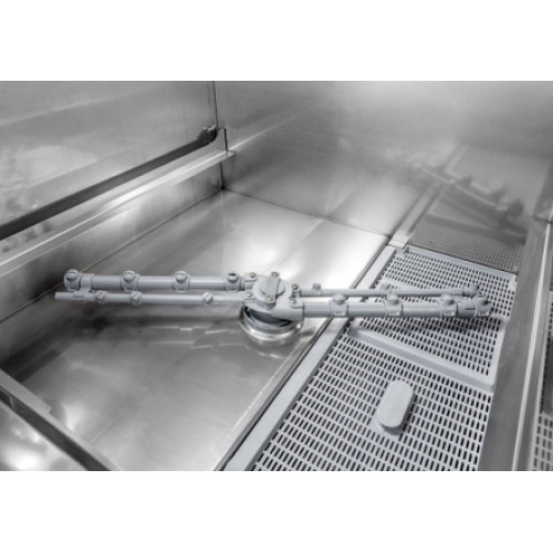 Удобная в работе механическая панель управления. Два промывочных рукава. Корпус посудомойки из нержавеющей стали. Цикл мойки составляет две минуты, а расход воды за цикл 2,7 л. Моющая камера объемом 12 л, а объем бойлера 5 л.