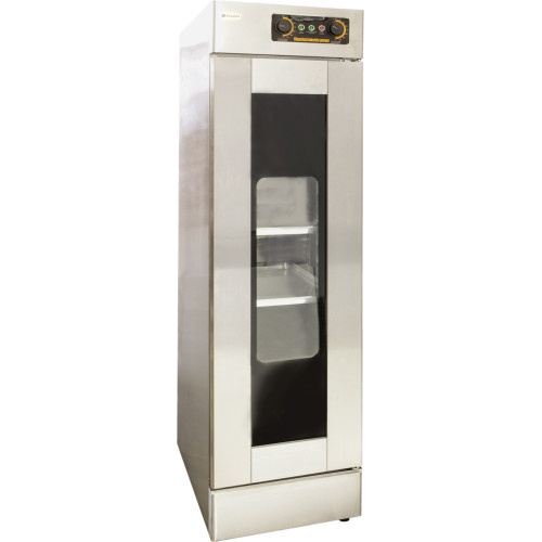 Данная модель вмещает 13 противней размером 600*400 мм. Между уровнями расстояние 80 мм. Расстойка теста происходит около часа при рабочей температуре от +35 до +40С и влажности 75-80%. Нагрев происходит трубчатыми нагревателями и парогенератором, которые автоматически поддерживают заданный температурный режим. В нижней части камеры находится накопительная емкость с водой (наполняют вручную), которая питает парогенератор водой, а специальный датчик автоматически поддерживает уровень воды. Стеклянная дверца камеры и внутренняя подсветка позволяют визуально наблюдать за процессом расстойки теста. Тесто, приготовленное в расстоечной камере, более мягкое, пористое, насыщенное углекислым газом и увеличивается в объеме до 40%.