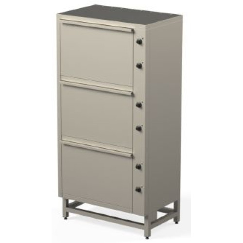 Данная модель на три секции. Внутренний размер шкафа 570*400*370 мм. Предусмотрено три уровня для противней. В комплекте в каждой секции по два противня размером 535*345*40 мм. Также можно использовать гастроемкость GN1/1.