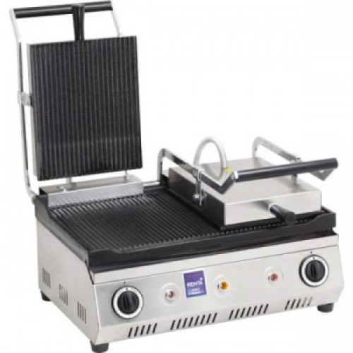 Гриль прижимной имеет две рабочие ребристые поверхности, каждая из которых имеет свой регулятор температур. Диапазон рабочих температур от +50 до +30 С. Размер рабочей части 490*310 мм. Верхние части оснащены прижимными пружинами.