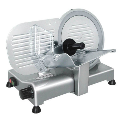 Конструкция слайсера имеет наклонный нож из н/ж стали диаметром 220 мм, с помощью которого можно регулировать нарезку толщиной до 14 мм. Имеет встроенное затачивающее устройство которое позволяет держать кромку ножа острой. Эта модель компактна и легка, что позволяет использовать ее как на небольших кухнях  ресторанов, так и в маленьких продуктовых магазинах.