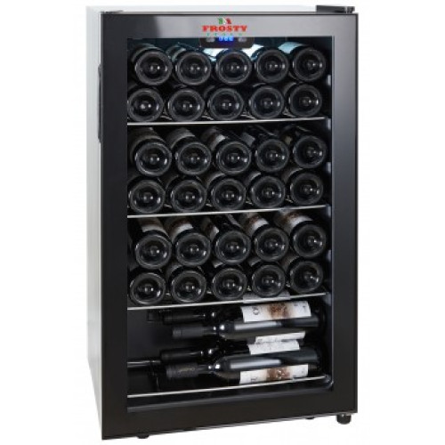 Корпус шкафа снаружи металлический окрашенный в черный цвет. Предлагаем купить винный шкаф Frosty KWS-34 по доступной цене. На профессиональное оборудование для кафе, баров, ресторанов гарантия один год.