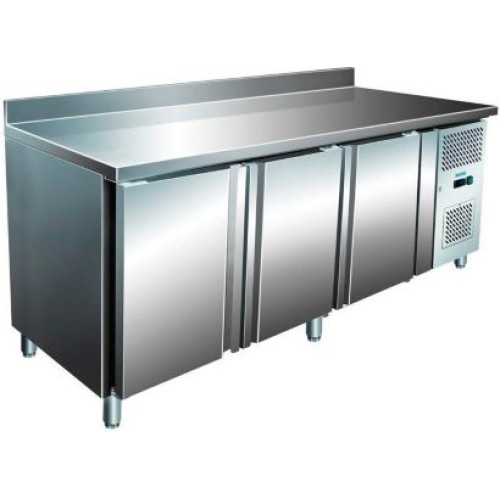 В комплекті три решітки під гастроємність GN1/1. Температурний режим від -18 до -22 С відображається на цифровому дисплеї. Динамічний тип охолодження забезпечує рівномірний розподіл холодного повітря всередині камери. Автоматичне відтаювання. Холодоагент R290. Холодильний агрегат розміщений справа. Корпус, стільниця виготовлені із нержавіючої сталі. Висота регулюється. Дана модель має пристінний борт.