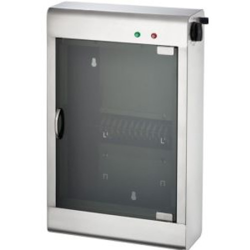 Дезинфекцию обеспечивает лампа, излучающая ультрафиолетовые лучи. Время стерилизации до 90 секунд. Панель управления механическая. Корпус выполнен из нержавеющей стали, дверцы из тонированного акрилового стекла. Тип - настенный. При открытии двери происходит автоматическое выключение лампы.