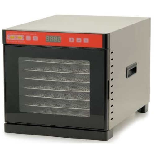 Дана модель має 8 сітчастих полиць розміром 310х310 мм. Вбудований таймер на 24 години. Температурний режим +35...+75 С відображається на цифровому дисплеї. Кнопки сенсорні. Рівномірне сушіння продуктів забезпечує горизонтально розміщений вентилятор всередині корпусу, який розподіляє потоки гарячого повітря по всій камері. Корпус, полички і блок управління виготовлені із нержавіючої сталі.