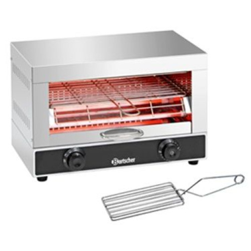 Горизонтальный тостер используют в барах и предприятиях фаст-фуда, изготовлен из нержавеющей стали, нагревательные элементы - кварцевые. Оснащен таймером. В комплекте 1 жарочная решетка, щипцы.