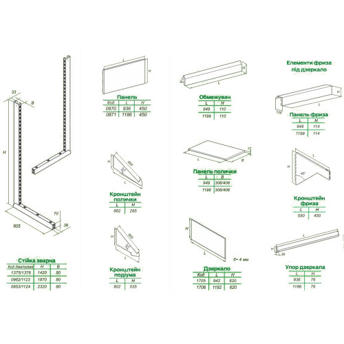 Элементы стеллажа       Кол-ство, шт        Цена, грн.