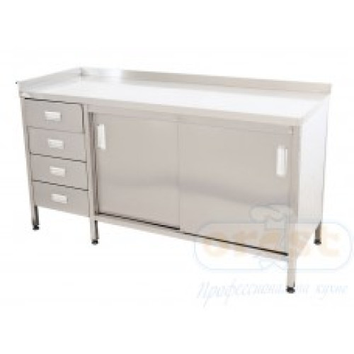 Стол-тумба используют на профессиональной кухне для хранения упакованных продуктов, посуды, кухонного инвентаря. Стол-тумба CSW-2D4 имеет полку, четыре выдвижных ящика на телескопических направляющих и распашные двери (купе), которые защищают от пыли, жирового налета все то, что хранится внутри.